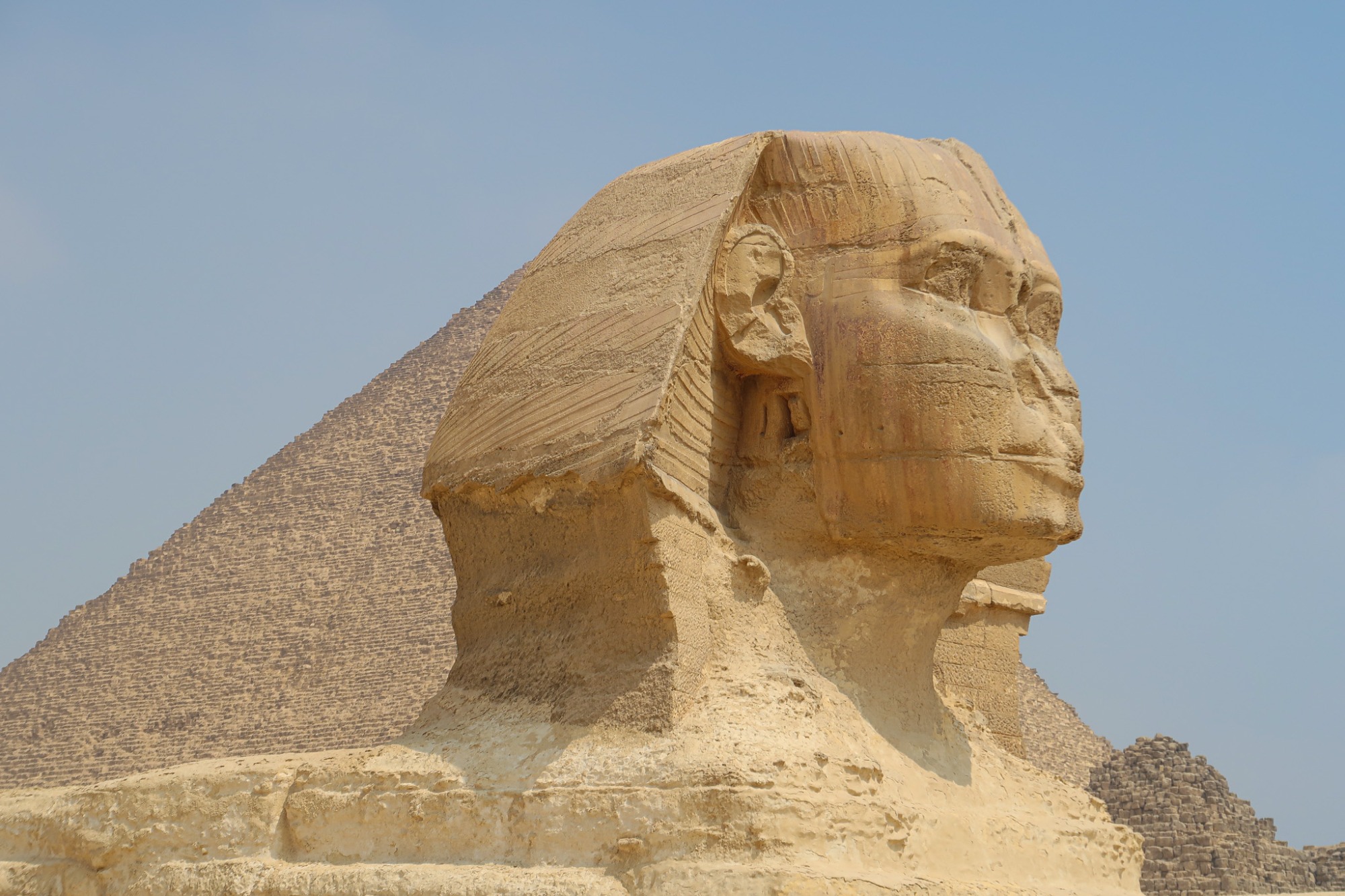 The Pyramid of Khafre: Slightly smaller but no less impressive, the Pyramid of Khafre is distinguished by remnants of its original limestone casing at the summit. Adjacent to the pyramid stands the iconic Sphinx, with its mysterious expression and lion’s body, believed to symbolise royal power and protection.