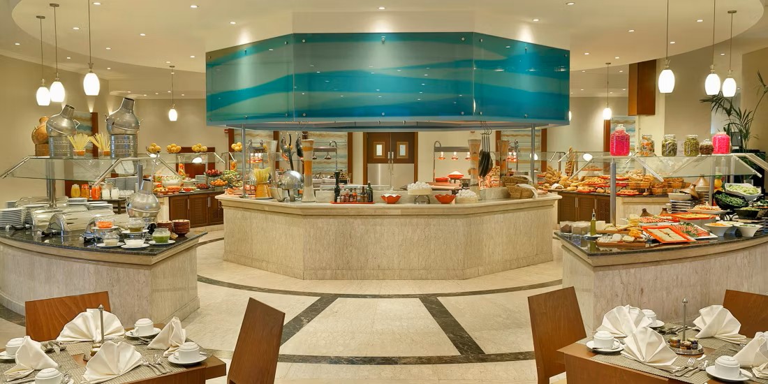 Ambrosia Restaurant, open for breakfast, lunch and dinner, this contemporary dining room features tables arranged around a central buffet and several live cooking stations. Prepared by our expert chefs, the selection is varied and tempting and includes fresh fruits, hot and cold appetizers and mains, tasty vegetarian options, regional specialties and a choice of rich pastries and desserts.