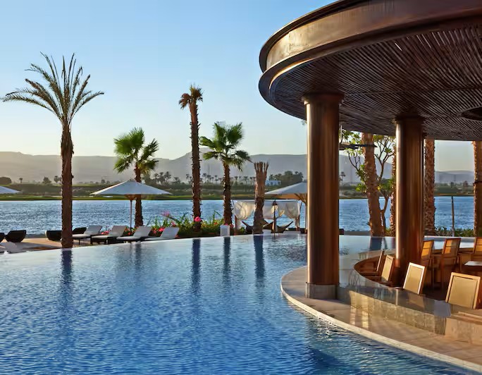 Facing the West Bank, the Hilton Luxor Resort rests on the edge of the River Nile, less than seven kilometers from central Luxor via a hotel shuttle. Both Karnak and Luxor temples are within four kilometers. The hotel boasts a fabulous holistic spa and two infinity pools.