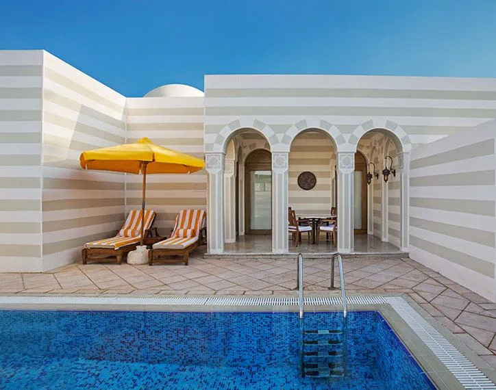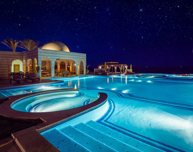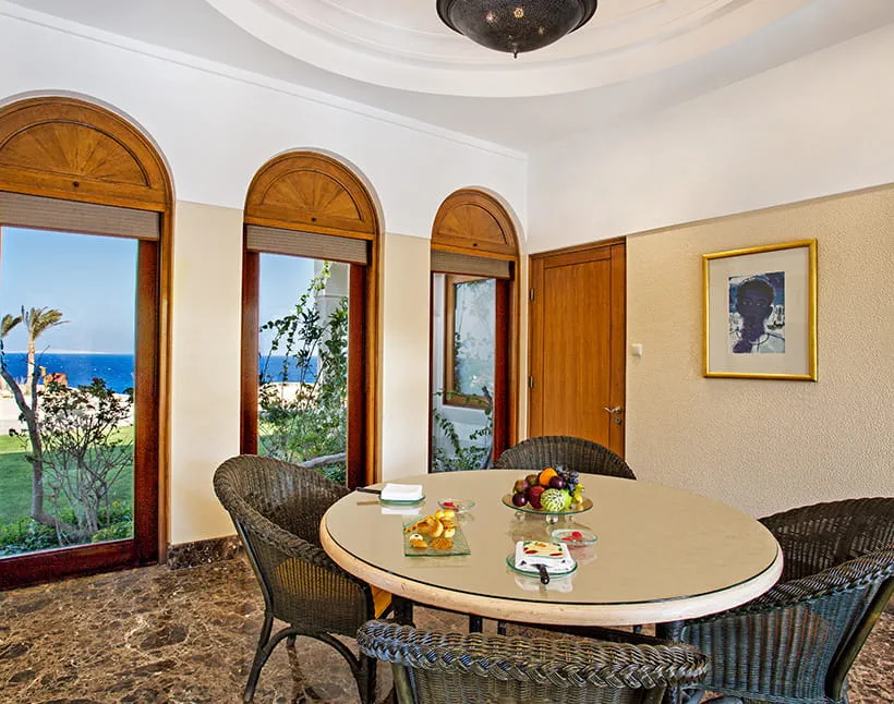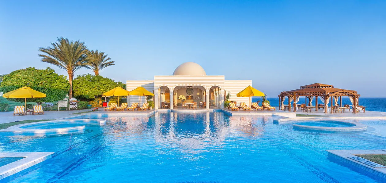 The Oberoi Resort Sahl Hasheesh Hurghada, set in 48 acres of prime beach front, is a five-star deluxe property celebrated for its elegant architecture, tranquil ambience, and personalised service. Set along the shores of the Red Sea, the resort features 102 spacious suites with private terraces, lush landscaped gardens, and exceptional dining experiences at its fine restaurants, where guests can savour international and local cuisine in stylish surroundings. In addition, the Oberoi offers a luxurious spa, temperature-controlled swimming pools, and a range of recreational activities including tennis, snorkelling, and diving. With a strong commitment to excellence and attention to detail, The Oberoi Resort is an ideal destination for couples seeking relaxation, sophistication, and culinary delights on the Egyptian coast.