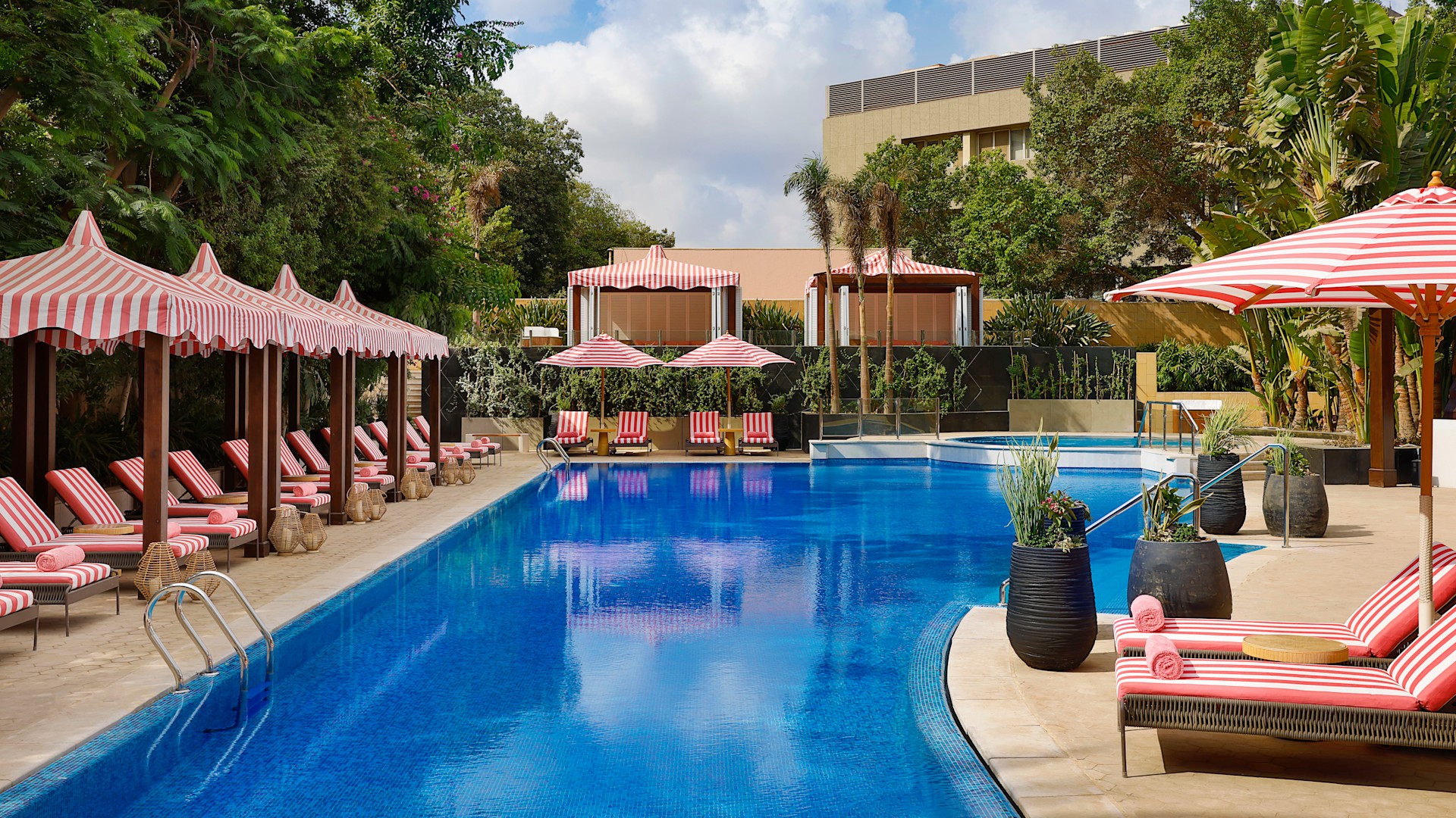 - Outdoor Pool: A temperature-controlled swimming pool surrounded by loungers and lush gardens, with poolside service available.